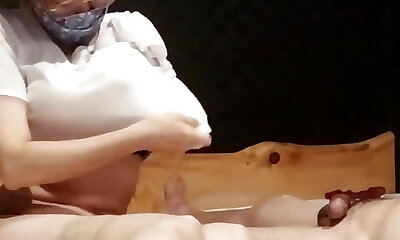 Japanese sweetheart oils up his cock and gives him a footjob